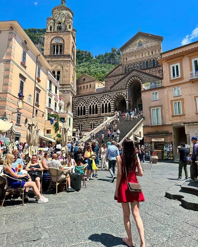 이탈리아 아말피에서 포착된 김세연 아나운서의 휴양지 패션이 여행객들의 감성을 자극하고 있다. 햇살 가득한 여름날, 고풍스러운 성당과 계단을 배경으로 촬영된 이 사진은 마치 유럽 영화의 한 장면처럼 낭만적인 분위기를 풍긴다. 무엇보다 눈길을 사로잡는 건 그녀의 선명한 레드 미니드레스다.
