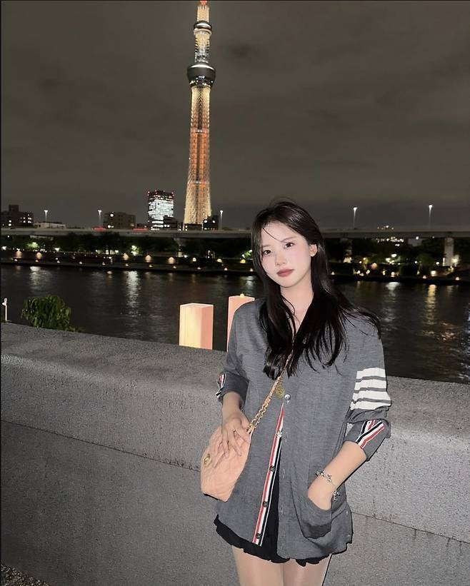 카디건 소매에 들어간 스트라이프 디테일이 캐주얼한 포인트를 더했고, 은은한 핑크 컬러 체인백은 전체 룩에 사랑스러운 감성을 가미했습니다.