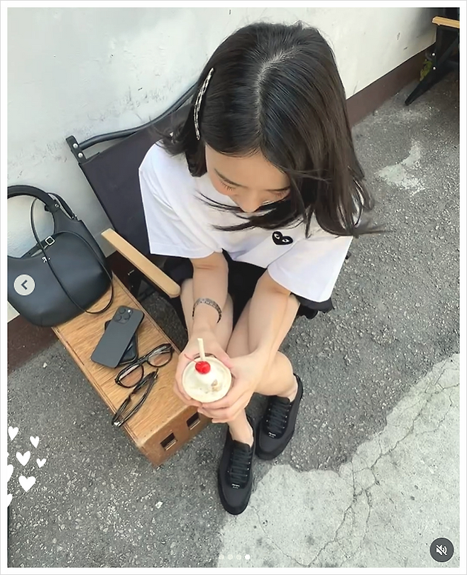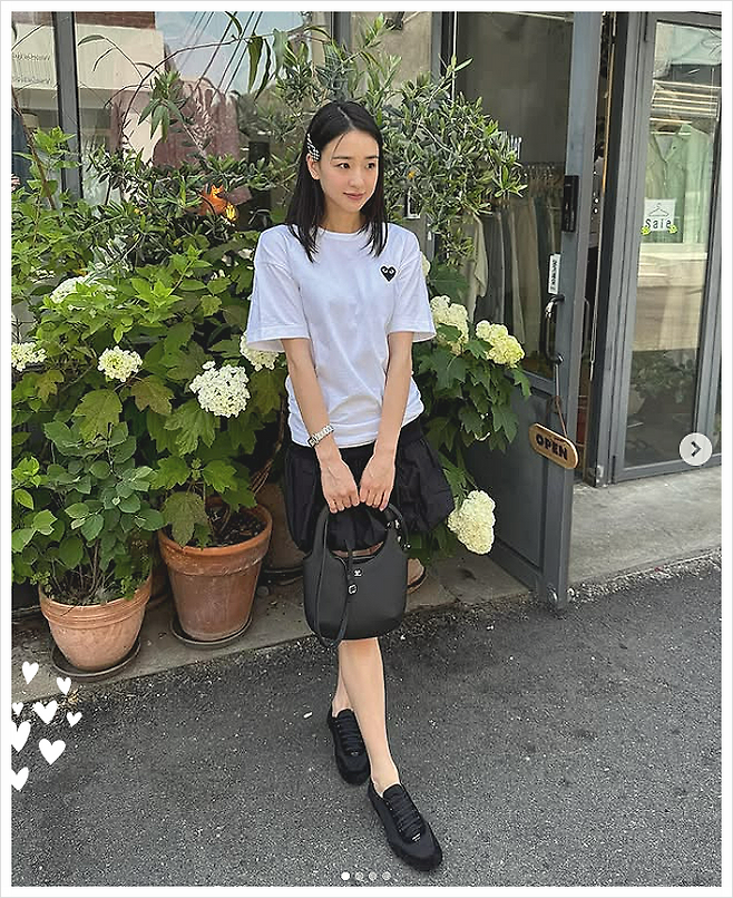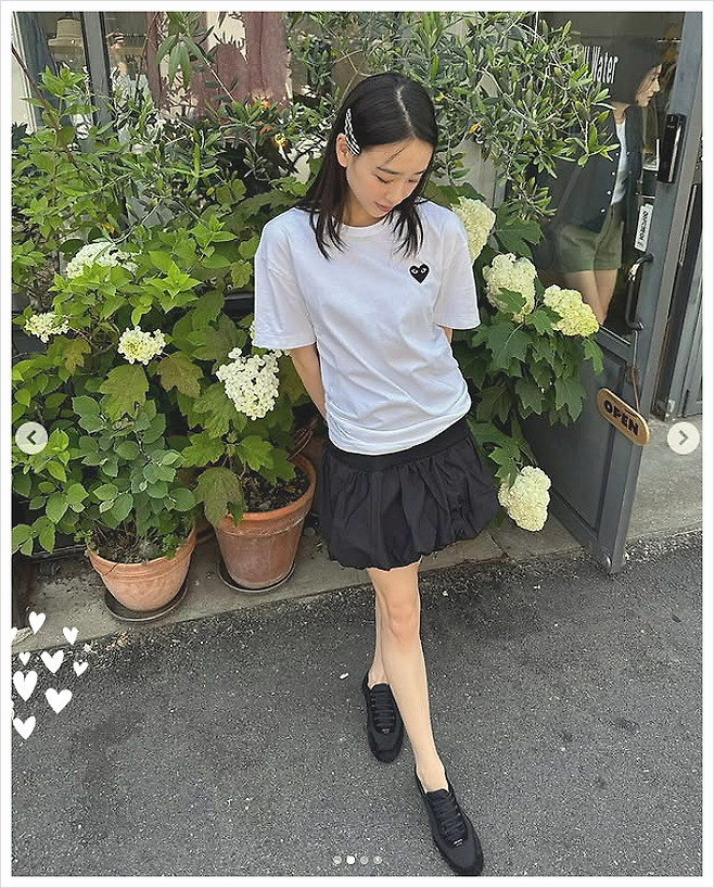 화이트 티셔츠와 블랙 스커트의 조합, 어찌 보면 흔할 수 있는 이 조합에 센스 있는 포인트를 더한 손연재 님의 스타일링. 그 중심에는 하트 로고가 인상적인 꼼데가르송 반팔 티셔츠가 있었습니다. 단정한 화이트 컬러 위에 작지만 확실한 존재감을 드러내는 하트 로고는, 보는 이로 하여금 트렌디한 무드를 자연스럽게 느끼게 했습니다.