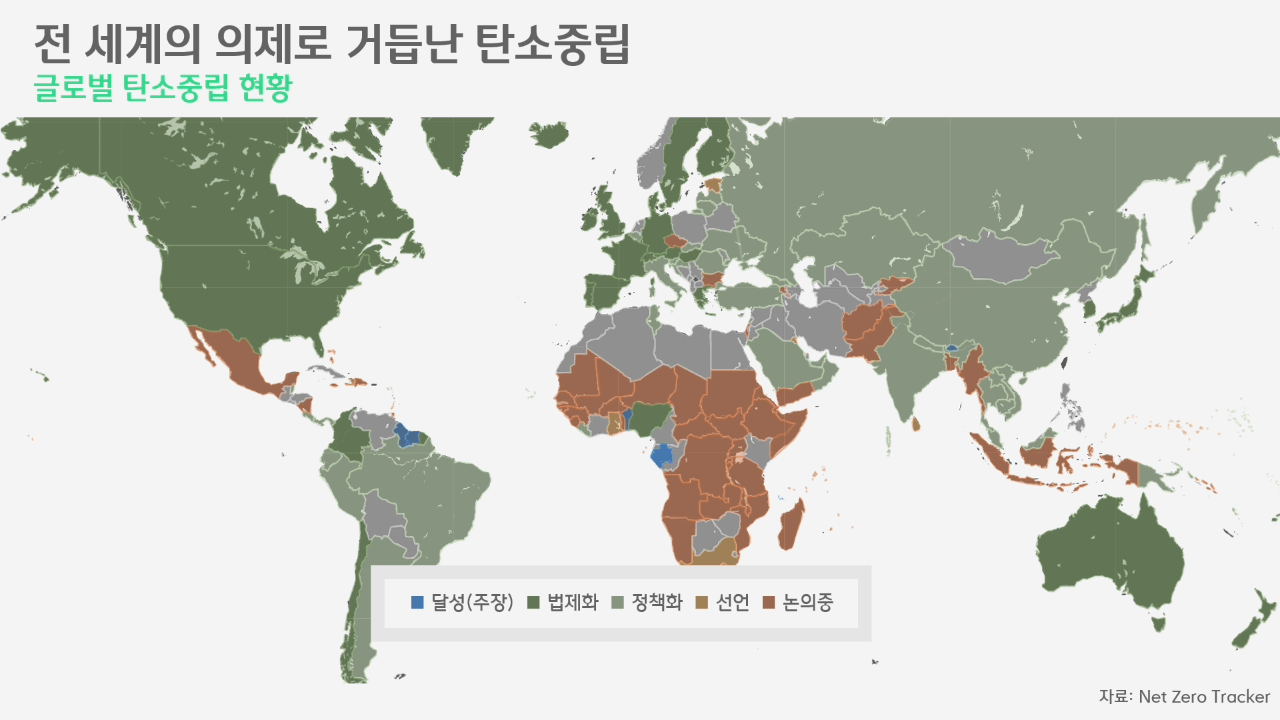 대부분 국가는 조기에 상당한 배출량 감소에 우선순위를 두고, 2030년까지 배출량을 절반으로 줄이는 것을 목표로 하고 있습니다. 참고로 아래 그림에서 전 세계 국가의 2050 탄소감축 목표를 한눈에 볼 수 있는데 2개 국가 '부탄'과 '수리남'은 이미 탄소중립을 달성하였고, 한국이 앞으로 얼마나 많은 노력을 해야 탄소중립을 달성할 수 있는가에 대해 시사하는 바가 큽니다.