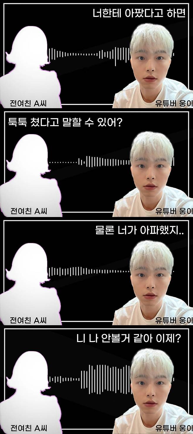 이에 16일 '연예뒤통령 이진호' 측도 웅이와 A씨의 통화 녹취록을 공개했다. A씨는 이별 후 힘들다는 웅이에게 "근데 그렇게 사랑했던 사람을 왜 그렇게 심하게 때렸냐"고 물었다. 웅이는 "내가 손가락을 '알아듣겠어?' 얘기하면서 툭툭 치고. 물론 그 강도가 너한테 아팠다고 하면"이라 말했고 A씨는 "너 나한테 툭툭 쳤다고 말할 수 있어?"라고 물었다. 이에 웅이는 " 물론 네가 아파했지"라고 답했다. 이어 웅이는 "때려서 미안해. 나는 너무 다시 만나고 싶지"라고도 말했다.