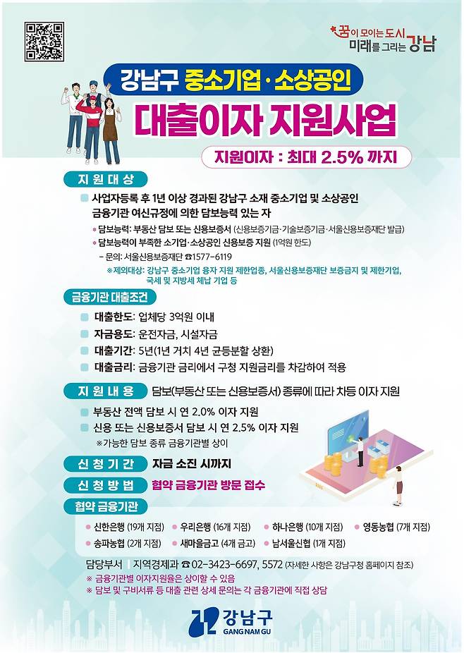 대출원금 총 1천억원 규모로 진행하는 이번 대출이자 지원사업은 사업자등록 후 1년 이상 사업을 유지 중인 강남구 소재 중소기업·소상공인을 대상으로 한다.
