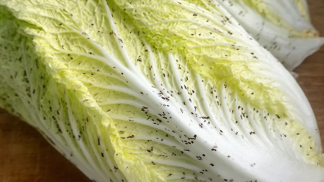 밑동을 정리했다고 끝은 아닙니다. 배추의 잎 사이 깊은 주름은 흙먼지와 작은 벌레, 기생충 알이 가장 잘 숨어드는 공간입니다. 물만 끼얹어서는 제거되지 않고, 펼쳐보면 미세한 점이나 먼지가 남아 있는 경우도 흔합니다.