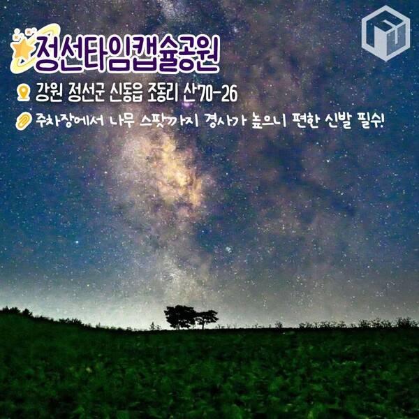 정선 타임캡슐공원은 해발 850m 새비재 정상에 조성된 고원 공원입니다. 영화 엽기적인 그녀의 촬영지로도 유명하죠. 낮에는 공원의 큰 소나무를 둘러싼 타입캡슐 저장소를 감상하려는 관광객들이 많은데요. 주변에 인공광해가 없을 뿐더러 시야를 방해하는 요소가 없어 몇년 전부터 꾸준히 은하수 명소로 알려지고 있습니다.