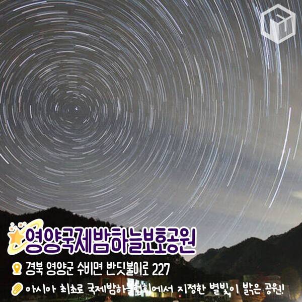 아시아 최초로 국제밤하늘협회가 지정한 '국제 밤하늘 보호공원'이 경북 영양군에 위치해있다는 사실을 알고 계셨나요? 세계적인 수준으로 별빛이 밝은 밤하늘로 인정된만큼 구름과 달빛이 적은 날 방문하면 높은 확률로 별과 은하수를 감상할 수 있는 별 명소입니다.