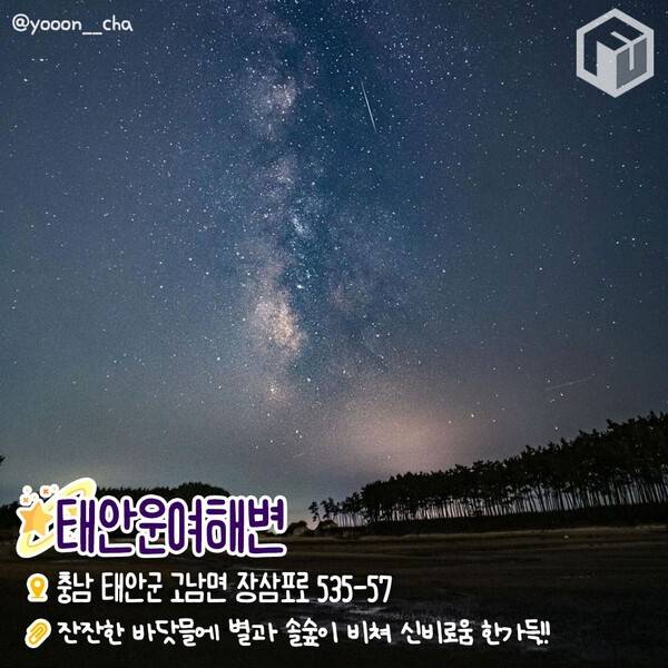 일출과 일몰 명소로 유명한 태안의 운여해변입니다. 운여해변은 차박명소로도 이미 잘 알려져있죠. 여러모로 운여해변이 아름다운 명소로 소문난 것에는 서해안의 특징인 '물때'와 바다 앞 '솔숲'이 큰 역할을 했습니다. 물때에 따라 바닷물이 얕게 깔릴 때면 솔숲이 얕은 물에 반영되어 마치 물 위에 떠있는 듯 신비로운 풍경을 완성하기 때문이죠.
