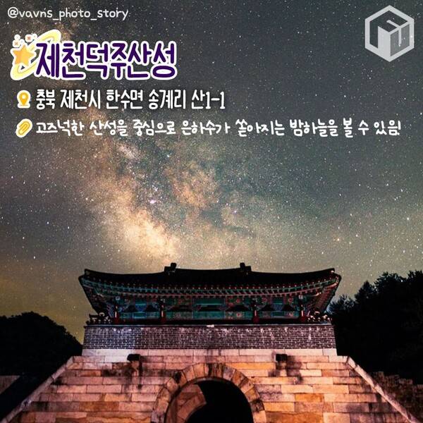제천 덕주산성은 고즈넉한 산성의 형태를 중심으로 은하수의 궤적이 동그란 모양을 만드는 경우가 많아 사진작가들이 사랑하는 은하수 명소입니다. 주변에 민가나 가로등 등 시야를 가리거나 인공빛을 내는 요소가 없어 하늘에 빼곡히 차있는 별과 은하수를 선명하게 감상할 수 있습니다.