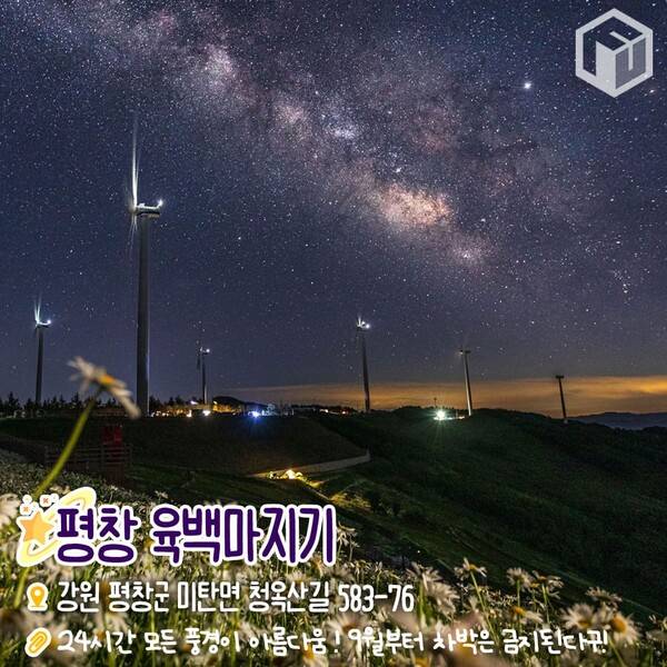 해발 1,256m에 위치한 평창 육백마지기는 상쾌한 공기와 그림같은 풍경이 펼쳐지는 평창의 필수 여행 코스입니다. 차량으로 올라갈 수 있어 접근성 또한 용이한데요. 고도가 높고 공기 수분이 적어 별을 관측하기에는 최적의 조건을 지닌 국내 은하수 명소입니다.
