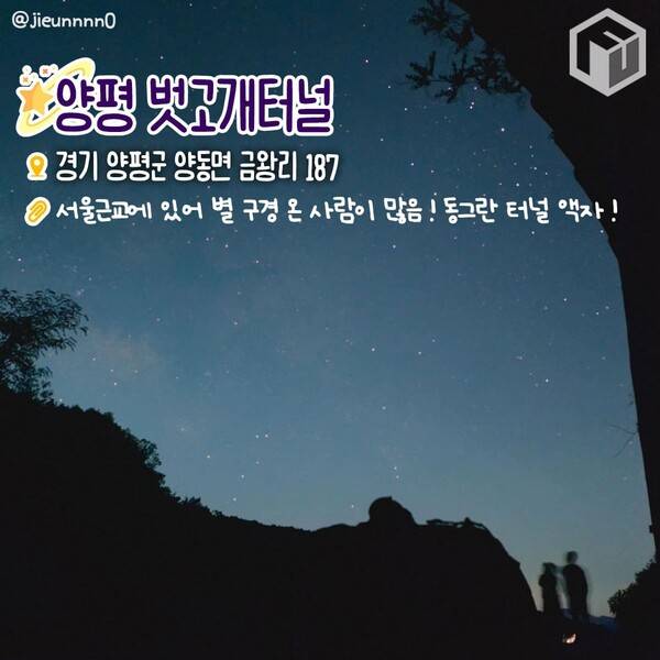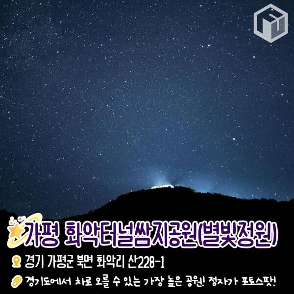 예능프로그램에서 가수 화사가 별을 보기 위해 방문하며 알려진 서울 근교 은하수 명소 가평의 화악터널 쌈지공원입니다. 현재는 별빛정원이라는 이름으로 안내되고 있는데요. 경기도에서 차량으로 오를 수 있는 가장 높은 870m 고도에 위치해있어 맑은 공기를 마시며 별 구경을 하기 좋습니다.