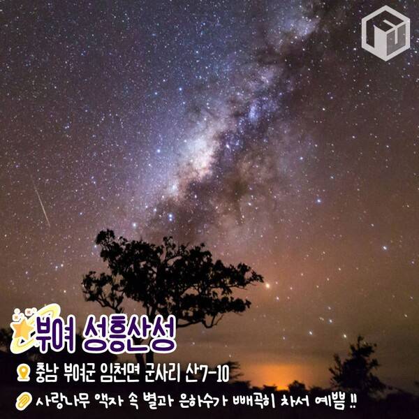 낮의 '사랑나무'가 유명한 성흥산성은 사실 은하수 명소이기도 합니다. 언덕 아래 마을에서 발생하는 인공 광해가 있긴 하지만, 높은 하늘에 떠있는 별까지는 닿지 않는지 매년 여름에서 가을이 되면 밤하늘의 은하수를 선명하게 관찰할 수 있습니다. 새벽시간에 방문하면 느티나무 너머로 빼곡한 별을 볼 수 있기도 하니 하트 속 별이 담긴 모습도 담을 수 있겠죠?