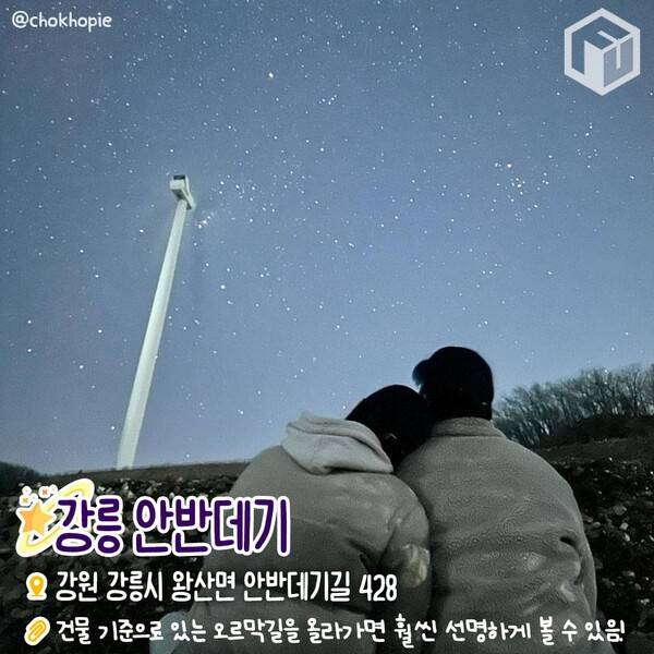 부드러운 능선 위의 풍력발전기가 이국적인 은하수 풍경을 만들어주는 강릉 안반데기에서는 구름이 없다면 언제든지 쏟아지는 별을 볼 수 있습니다. 와우안반데기 건물울 기준으로 있는 오르막길을 따라 올라가면 인공광해에서 조금이나마 벗어날 수 있으니 방문 시 참고하셔서 성공적으로 별 구경을 해보시길 바랍니다.