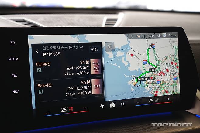 먼저 그릴에 조명이 점등되는 아이코닉 글로우, 최신 LED 헤드램프, 커브드 디스플레이, 티맵 지원 헤드업 디스플레이, 전동식 트렁크, OS9과 티맵 기반 내비게이션, 최신 운전자보조, 그리고 완전자동주차를 지원하는 파킹 어시스턴트 플러스가 기본이다. 통풍시트는 빠진다.