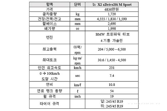 X2 xDrive20i MSP에는 2.0리터 4기통 터보엔진과 7단 듀얼클러치 변속기, xDrive 사륜구동을 통해 최고출력 204마력(5000-6500rpm), 최대토크 30.6kgm(1450-4500rpm)다. 공차중량 1720kg, 100km/h 가속 7.4초, 최고속도 231km/h, 연비 10.8km/ℓ(도심 9.4, 고속 13.1)다.