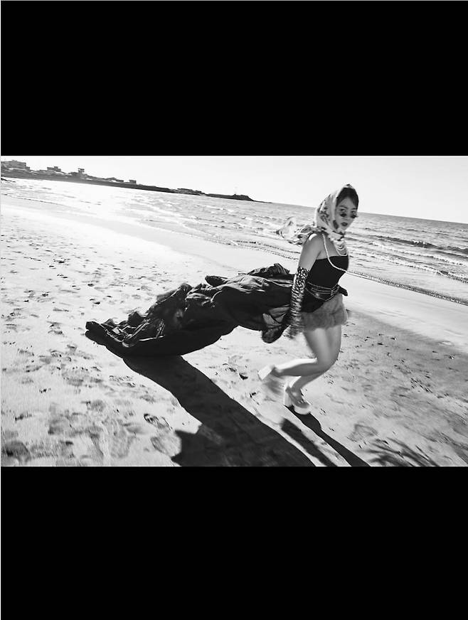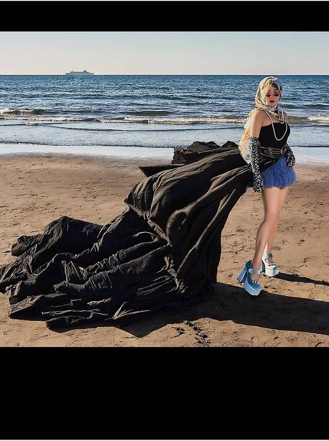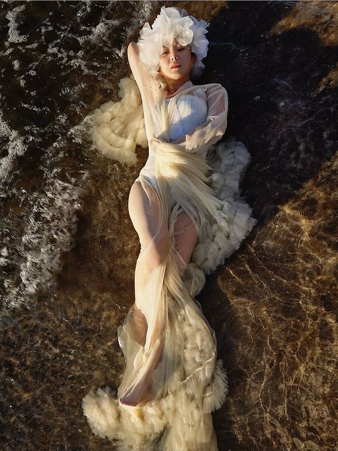 특히 시스루 케이프 아래 화이트 스윔웨어가 드러나는 레이어드 스타일링은 몽환미와 관능미를 동시에 자아내며 이목을 집중시켰습니다.