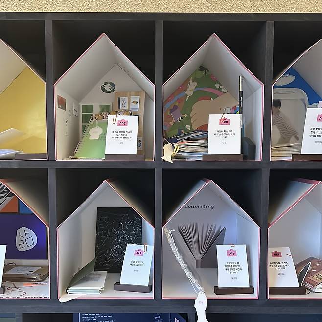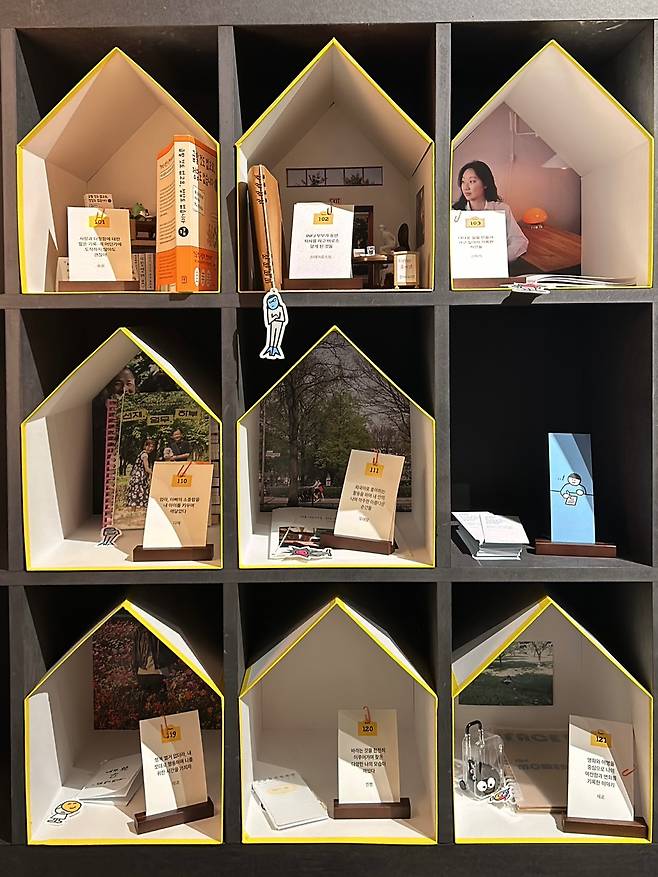 한 사람의 기록물을 단순히 보여주는 게 아니라 하나의 집으로 표현한 점이 인상 깊었다. 집은 온전히 자기 자신으로 존재할 수 있는 공간이라는 점에서 한 사람이 써 내려간 내밀하고 진솔한 기록을 담기에 알맞다. 한 사람의 기록들이 쌓여 하나의 집을 이루고, 여러 집들이 모여 있는 모습은 마치 하나의 아파트 단지를 연상케 한다. 다정한 입주민들이 복작복작 모여 있는 그런 아파트 단지를.