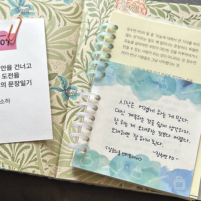 누군가의 기록물을 펼쳐보는 건 한 집씩 찾아가 조심스레 초인종을 누르는 일이었다. 그 안에는 누군가의 삶이, 소소하지만 확실한 행복이, 치열한 고민의 흔적이, 불안을 딛고 자신을 응원하는 마음이 있었다. 나를 행복하게 하는 건 아무래도 수박이라며 수박을 먹고 남은 라벨을 모은 진(zine)부터 책을 읽고 수집한 문장에서 나아갈 힘을 얻은 기록물까지. 어떤 기록은 웃음이 새어 나올 만큼 귀여웠고, 어떤 기록은 내 마음을 빼다 박은 듯해 괜스레 내적 친밀감이 올라갔다.