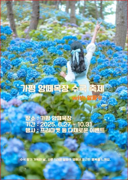 꽃길을 걷는 것도 설레는데 사랑스러운 알파카와 함께라면 어떨까요? 자연의 풍경이 살아 있는 가평 양 떼목장에서 올해도 특별한 축제가 펼쳐지고 있습니다. 바로, 수국꽃과 동물이 어우러지는 유일무이한 가을 축제‘2025 가평 양 떼목장 수국축제’인데요. 자연과 교감하고, 추억도 남기며, 힐링까지 얻을 수 있는 오감만족 체험형 축제를 소개합니다.