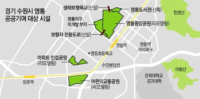 공공기여금 활용처는 △영통도서관 신축 △영흥숲공원∼영통중앙공원 생태보행육교 설치 △영통중앙공원 리모델링 △보행자 전용도로 △교통공원 리모델링 △아파트 인접 공원 리모델링 등 6가지로 정했다.