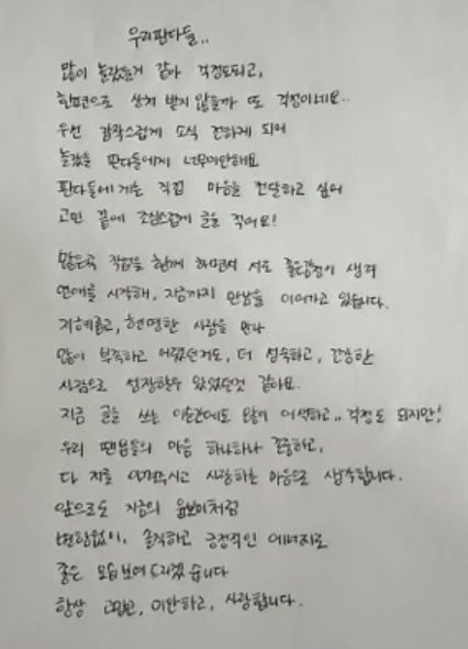 이 편지를 받은 팬들은 "괜찮다, 행복해라"라며 응원의 메시지를 전했고, 훈훈한 분위기가 이어졌다.