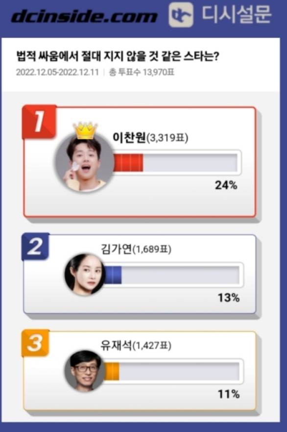 지난 12일 커뮤니티 포털사이트 디시인사이드(대표 김유식)는 ‘법적 싸움에서 절대 지지 않을 것 같은 스타는?’이라는 주제로 투표를 진행한 결과 이찬원이 1위에 올랐다고 밝혔다.