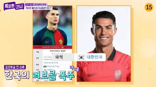 더불어 그는 "나 너무 웃긴 게 호날두가 중간에 교체됐잖냐. 우리나라 사람들이 아쉬워하더라"라고 해 시청자의 웃음을 샀다.