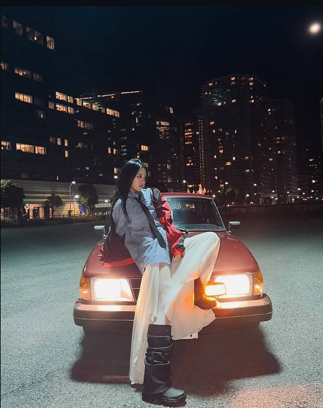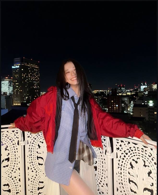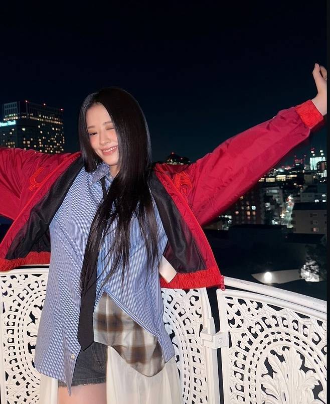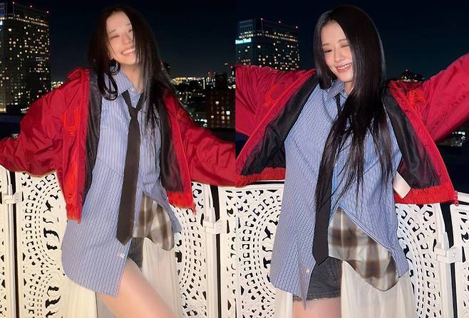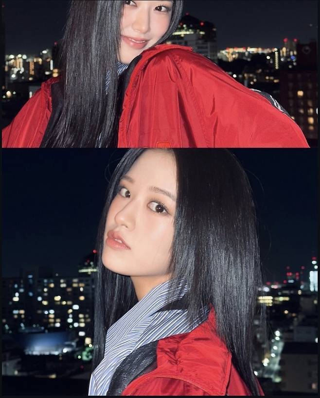 여기에 강렬한 레드 컬러의 항공 점퍼를 더해 스트리트 감성을 극대화했으며, 내추럴한 생머리 스타일과 환한 미소가 소녀 감성을 더했습니다.