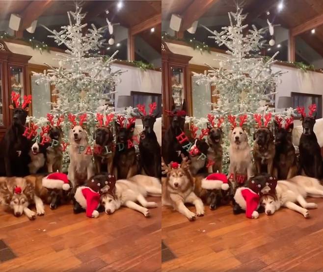 머리띠를 다 쓴 11마리의 대형견들은 예쁘게 꾸며진 크리스마스트리 앞에 모여 앉아 있습니다. 해피 크리스마스를 맞이하는 대형견 가족이 준비한 크리스마스 가랜드는 Happy pawl days라고 적혀 있습니다. 강아지들이 말할 법한 가랜드죠?