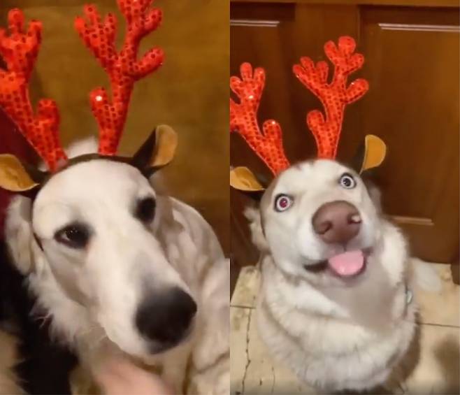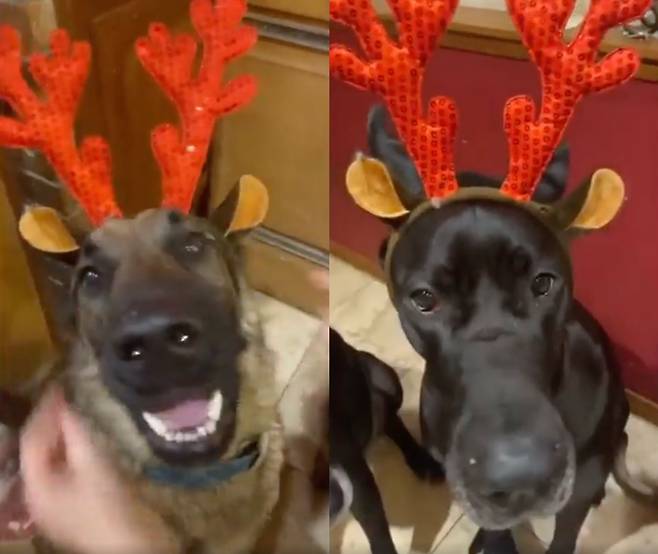여름과 겨울 사이를 오가고 있는 요즘, 2024년의 끝이 다가오고 있습니다. 이에 벌써 크리스마스를 준비하는 대형견들이 있습니다. 주인은 대형견 한 마리 한 마리씩 직접 루돌프 머리띠를 씌워줍니다.