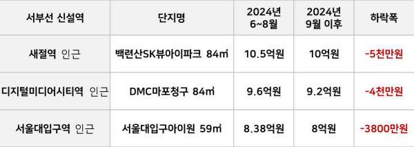 디지털미디어시티역 인근인 서울 서대문구 북가좌동 DMC한양 아파트 84㎡ 지난 6월 8억1500만원까지 올랐다가 9월 7억9000만원까지 하락했다. 마포구 DMC마포청구 같은 주택형도지난 6월 9억6000만원까지 올랐지만, 9월 4000만원 하락한 9억2000만원에 실거래됐다. 서부선 경전철 종점인 서울대입구역 인근 관악구 봉천동 ‘서울대입구아이원’ 아파트 59㎡는 지난달 8억원에 거래돼 6월보다 3800만원 하락, 2021년 말 최고가 10억3000만원보다 2억3000만원 떨어졌다.