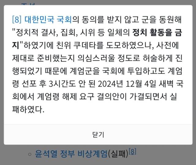 특히 나무위키는 한국사 항목에서 친위쿠테타 살례로 윤석열 정부 비상계엄(실패) 사례에 대한 부연 설명으로 "대한민국 국회의 동의를 받지 않고 군을 동원해 정치적 결사, 집회, 시위 등 일체의 정치 활동을 금지하였기에 친위 쿠데타를 도모하였으나 사전에 제대로 준비했는지 의심스러울 정도로 허술하게 진행되었기 때문에 계엄군을 국회에 투입하고도 계엄령 선포 후 3시간도 안 된 2024년 12월 4일 새벽 국회에서 계엄령 해제 요구 결의안이 가결되면서 실패하였다"고 소개하고 있다.
