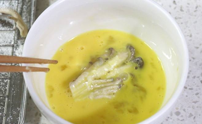 부침가루, 계란, 물, 소금으로 반죽을 만든 다음 버섯을 넣어 섞어줍니다.