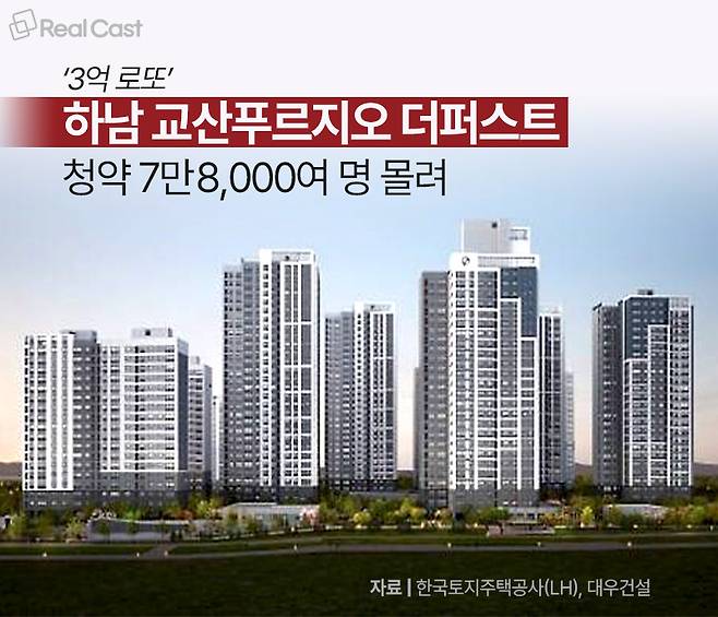 5월 분양한 부천대장지구 A7블록은 일반공급 110가구 모집에 1만3,312건이 접수, 평균 121대 1을 기록했고, 하남 교산 A2블록 교산푸르지오 더 퍼스트 일반공급 201가구에 5만2,920건이 접수, 평균 263대 1을 기록했습니다. 특별공급도 2만5,012건이 접수돼 평균 134대 1로 마감됐습니다.