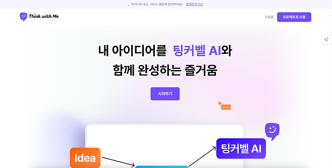 첫 번째로 소개할 Think with me는 AI를 활용해 아이디어 브레인스토밍, 디벨롭을 도와주는 서비스에요. 서비스 개발을 위한 아이데이션에 주로 초점을 맞추고 있어요.