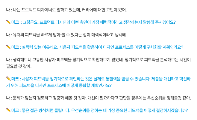 이 중에 하나의 꼭지를 골라 대화를 시작하게 되는데요, 기본적인 사용법은 친구와 이야기하는 것처럼 마이크에 직접 이야기하는 방식입니다. (하지만… 영어로 내 고민을 이야기 한다는건… 너무 가혹하잖아요 🥹) 다행히 채팅으로 대화를 나눌 수 있는 기능도 제공하고 있어요. 저는 ‘프로덕트 디자이너의 커리어에 대해 고민중이야.’ 라는 내용으로 대화를 시작해보았습니다. 아래는 실제 마크와 대화한 내용이에요. (번역투가 조금 어색할 수 있어요)
