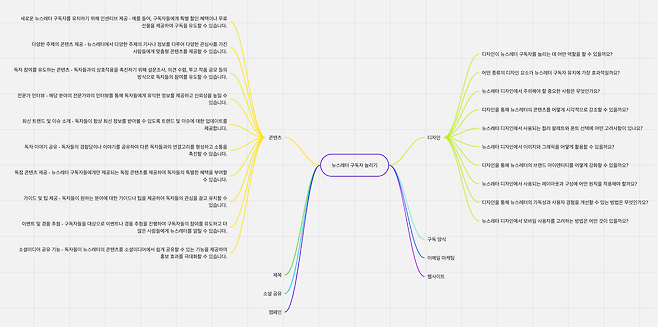 저는 ‘뉴스레터 구독자 늘리기’를 입력한 뒤 어시스트를 실행해 마인드맵 생성 버튼을 클릭해 봤는데요. 콘텐츠, 제목, 소셜 공유, 캠페인, 디자인, 구독 양식, 이메일 마케팅, 웹사이트 등 8개 키워드가 연결된 것을 확인할 수 있었어요. 이렇게 1차로 생성한 키워드를 바탕으로 추가로 고려할 내용을 입력하는 방식을 활용했죠. 그리고 콘텐츠 키워드를 선택한 뒤 아이디어로 확장하기를 선택했는데