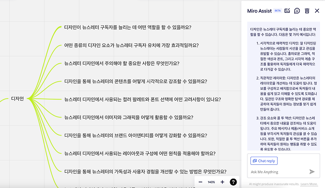 마인드맵 생성 기능을 통해 가지에 따라 다양한 내용을 확인하다 조금 더 깊게 생각해 볼 내용이 있다면, ‘무엇이든 물어보세요’ 기능을 활용해 보세요. 채팅 형식으로 답변을 이어서 확인할 수 있어요. 예를 들어, 저는 디자인이 뉴스레터 구독자를 늘리는데 어떤 역할을 할 수 있을까요?를 질문으로 생성하기 기능으로 확인했는데요. 보다 구체적인 답변을 얻고 싶어 채팅으로 남겼더니 4가지 상세 답변을 확인할 수 있었어요. 이렇게 생성된 답변은 미로 내 ‘스티키 노트’로 생성해 적용하는 것도 가능해요.