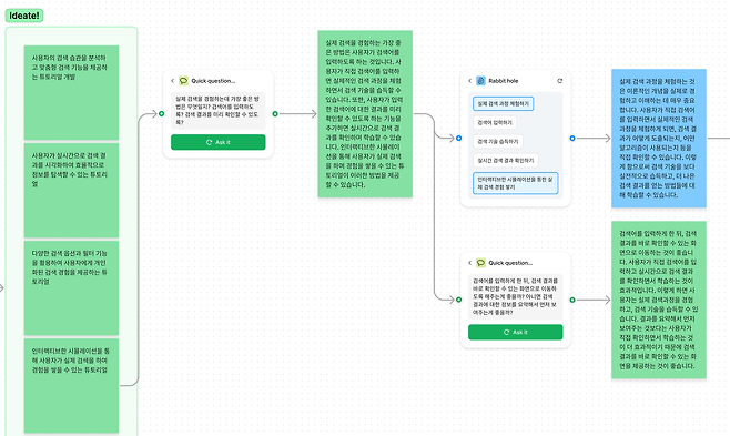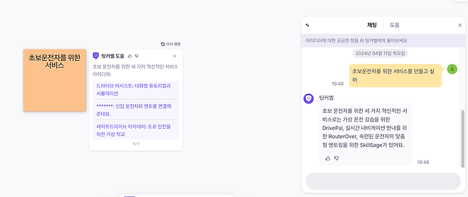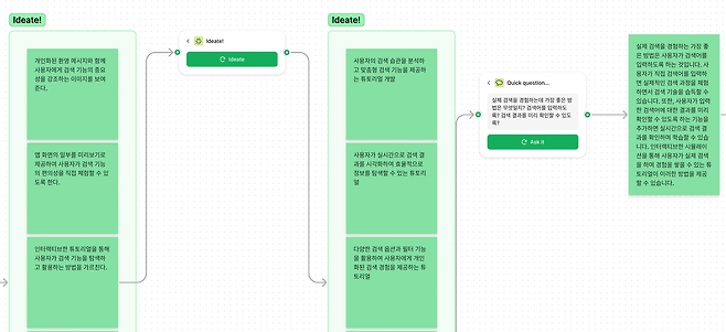 보드에서는 관련 아이디어를 추천해 주고, 채팅에서 추가 질문을 통해 관련된 정보를 얻을 수 있도록 구성되어 있었어요. 포스트잇에 아이디어를 작성하면, 팅커벨 AI가 관련 아이디어를 3개씩 추천해 주는데요, 추천된 내용 중하나를 클릭하면 연관된 아이디어가 생성되고 또다시 추가적인 아이디어를 3개씩 추천해 주는 식으로 반복되는 구성이에요.