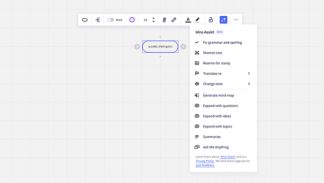 마인드맵 생성을 도와주는 미로 어시스트에는 여러 편의 기능이 포함되어 있어요. 입력한 텍스트(내용)에 대한 기본적인 맞춤법 검사는 물론, 명확하게 다시 쓰는 등의 편집 기능은 물론이고 번역과 톤을 바꿔주는 기능도 포함되어 있죠. 또 마인드맵 생성으로 시작해, 질문과 아이디어, 토픽 등으로 마인드맵을 확장할 수 있는 기능과 물어보기 등도 사용할 수 있어요. 마인드맵 자체가 사고를 확장하고 연관 내용을 계속 이어서 사고할 수 있도록 도와주는데, 이렇게 AI가 도와주니 막힘없이 쭉쭉 내용을 이어 붙이며 도움을 받을 수 있어요.