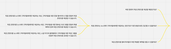 콘텐츠 키워드에 해당하는 아이디어 중, 독점 콘텐츠 제공이 있었는데요. 이 아이디어를 선택한 뒤, 생각해 볼 질문으로 세 가지를 추천받은 뒤 다시 한번 하나를 선택해 아이디어를 생성한 모습이에요. 독점 콘텐츠는 누구에게 제공할 것인지? 에 대한 질문에 대한 답을 구체적으로 확인할 수 있었고 이런 식으로 뉴스레터 구독자 늘리기와 관련된 구체적인 실행 방안을 참고할 수 있게 되었습니다.