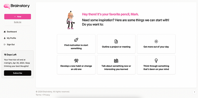 여러분들은 문제를 고민하다가 막힌 것 같은 느낌이 들 때, 누군가와 대화하면서 고민이 해결된 경험이 있으신가요? brainstory에서는 그 역할을 ‘Mark’라는 연필 캐릭터가 해주는데요, 마크가 하는 질문에 답을 하면서 문제에 대해 생각을 정리할 수 있어요.