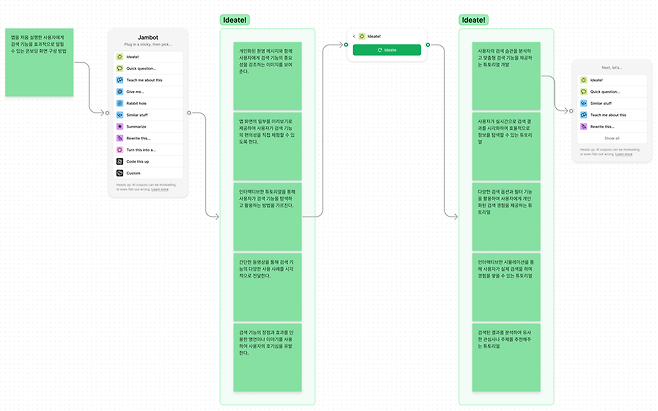피그잼 잼봇의 장점은 지금부터 시작인데, 생성한 아이디어 내용을 바탕으로 계속해서 내용을 추가할 수 있기 때문이에요. 마인드맵과 같은듯 다른 방법으로 활용이 가능하죠. 최초 생성된 아이디어 중, ‘인터랙티브 한 튜토리얼을 통해 사용자가 검색 기능을 탐색하고 활용하는 방법을 가르친다.’를 선택한 뒤 다시 한번 아이디어를 생성해달라고 요청했는데요.