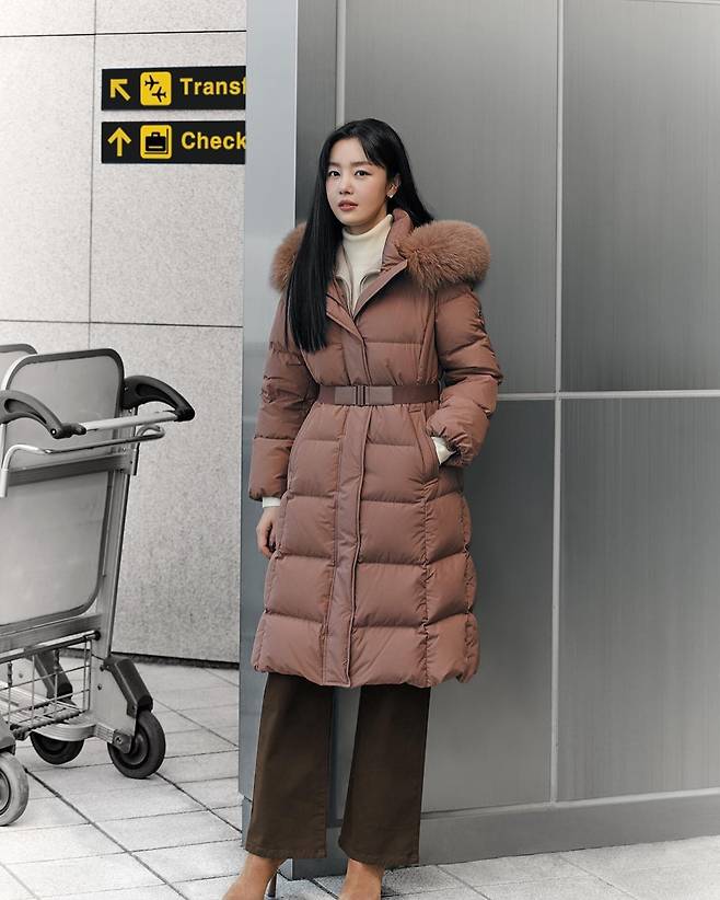 카라멜 브라운 컬러의 롱 패딩으로 겨울 시즌 스타일링을 선보였다. 퍼 후드와 벨트 디테일이 돋보이는 패딩에 아이보리 터틀넥과 와이드 팬츠를 매치해 세련된 공항패션을 연출했다. 자연스러운 스트레이트 헤어로 도시적인 분위기를 완성했다.