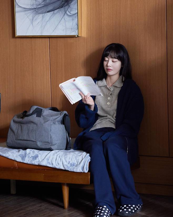 편안한 니트 폴로와 네이비 와이드 팬츠로 내추럴한 홈웨어 스타일을 보여주고 있다. 도트 무늬 슬리퍼로 귀여운 포인트를 주었으며, 시크한 뱅 헤어스타일로 새로운 매력을 드러냈다. 그레이 더플백과 담요로 아늑한 분위기를 더했다.