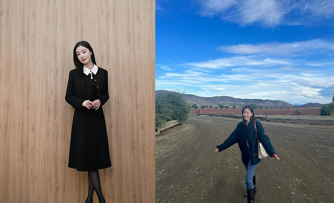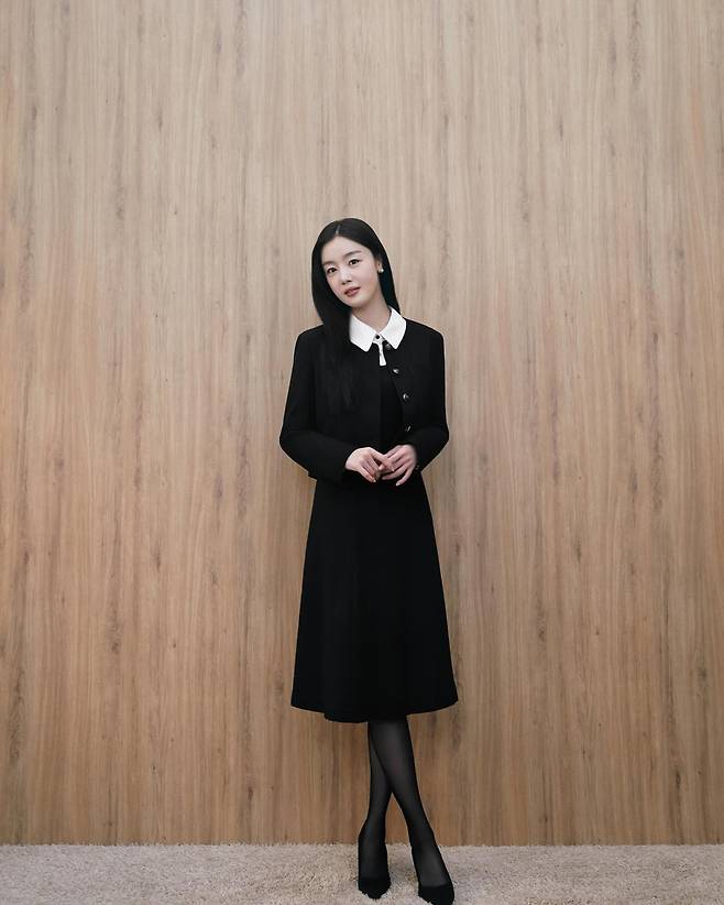 우아한 블랙 원피스로 세련된 분위기를 자아내고 있다. 화이트 카라와 리본 디테일이 포인트인 미디 길이 원피스에 블랙 스타킹과 힐을 매치해 단정하면서도 세련된 스타일을 완성했다. 긴 생머리와 내추럴한 메이크업으로 여성스러움을 더했다.