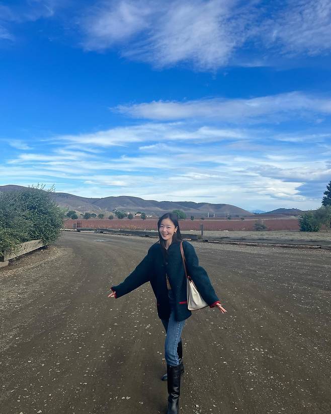 청명한 하늘을 배경으로 자유로운 분위기를 담아냈다. 네이비 컬러의 오버사이즈 코트에 데님 팬츠, 롱부츠를 매치해 편안하면서도 스타일리시한 캐주얼룩을 선보였다. 화이트 숄더백으로 포인트를 주었다.