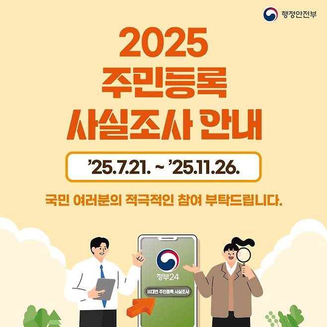 2025년 주민등록 사실조사는 전 국민 대상으로 진행되며, 비대면 참여 기간은 7월 21일(월)부터 8월 31일(일)까지, 방문조사는 9월 1일(월)부터 10월 23일(목)까지입니다. 8월 31일까지는 누구나 정부24 앱으로 빠르고 안전하게 조사에 참여할 수 있습니다.