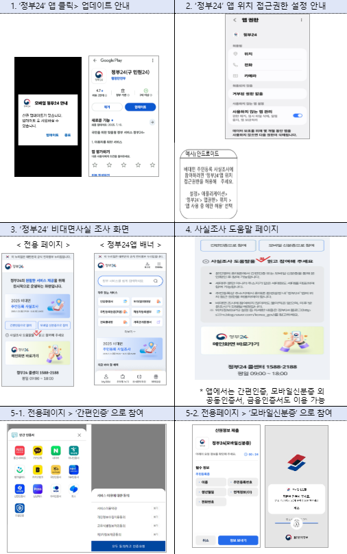 오늘까지는 정부24 앱으로 누구나 간편하게 참여 가능합니다. 위치 정보(GPS)와 실제 거주지 인증만 완료하시면 절차가 매우 간단합니다. 참여하시면 향후 방문조사 대상에서 제외될 수 있고, 불이익이나 과태료의 위험도 줄일 수 있습니다. 아직 참여하지 않으셨다면, 오늘 꼭 정부24 앱에서 참여하세요.