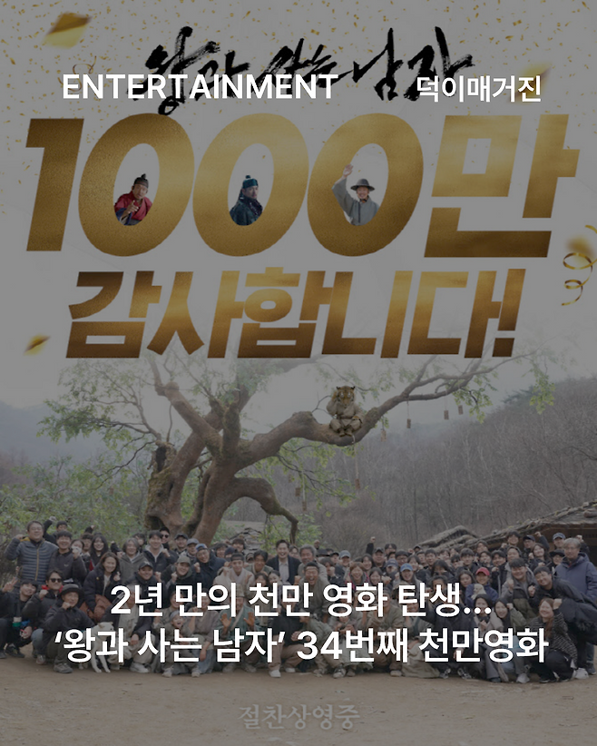 영화 왕과 사는 남자가 개봉 한 달여 만에 1,000만 관객을 돌파하며 올해 첫 천만 영화에 등극했습니다. 배급사 쇼박스는 6일 관객들에게 감사 인사를 전하며 “기꺼이 영화의 벗이 되어준 1,000만 관객에게 깊이 감사한다”는 메시지를 공개했습니다.