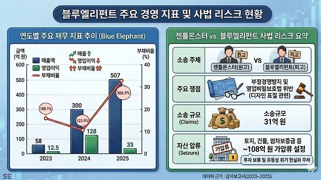블루엘리펀트는 젠틀몬스터 운영사 아이아이컴바인드와 부정경쟁방지법 위반 여부를 두고 법적 분쟁을 이어가고 있다. 민·형사 소송 규모는 31억원 수준이며, 우발부채로 토지와 건물, 임차보증금 등 108억원 규모 자산에 가압류가 설정된 상태다. 소송 결과를 예측하기 어려운 가운데, 분쟁 장기화 가능성이 경영 불확실성을 키우고 있다.