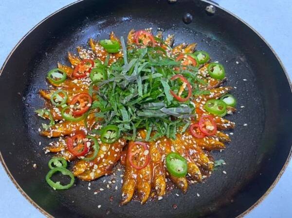 도리뱅뱅은 맛있게 양념된 빙어를 동그랗게 둘러 담아낸 요리입니다. 가운데 놓인 깻잎과 함께 먹으면 더욱 향긋한 맛을 즐길 수 있습니다. 양념의 맛과 빙어의 담백함, 깻잎의 향이 조화롭게 어우러져 특별한 맛을 만들어냅니다.